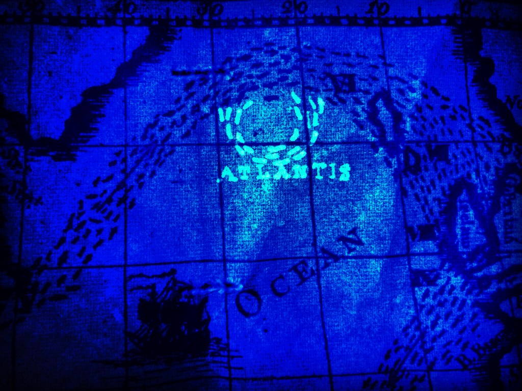 Holy smokes! I was trying a few experiments to see if there was any invisible ink on the map. I tried a few tricks like lemon juice and vinegar with no luck. When I turned on a blacklight, Atlantis lit up like a Christmas tree! I know I got lucky this time because they didn’t have blacklights back then and I’m not sure what type of invisible ink was used. Just knowing that there is more in this book than what’s visible at first glance is both exciting and nerve-racking. I don’t want to miss anything. Please let me know if you see anything in these images I’m uploading.