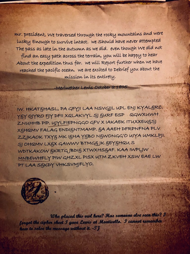 Who placed this owl here? Has someone else seen this? I forgot the cipher sheet I gave Lewis at Monticello. I cannot remember how to solve the message without it. Hopefully he remembered to change the code. -TJ”